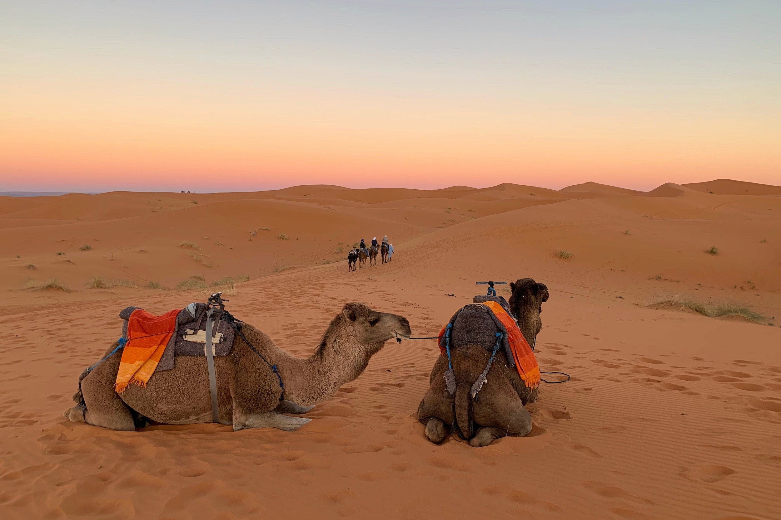 As we stepped out of our gas-powered vehicle, our next vehicle spat into the sand and kneeled down to greet us. We mounted two dromedary camels, and slowly traipsed our way to a tent in the dunes.